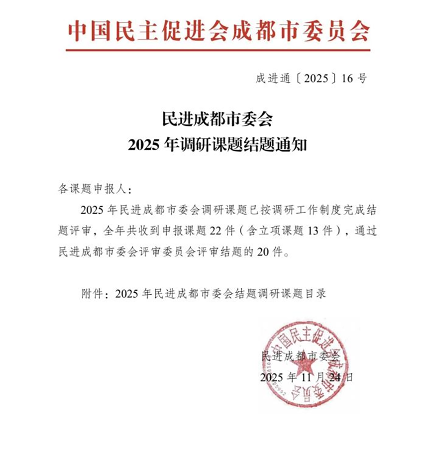民進(jìn)會(huì)員宋雨霜主持課題入選2025年民進(jìn)成都市委會(huì)結(jié)題調(diào)研課題目錄