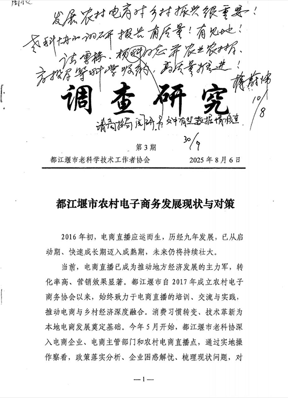都江堰市委書(shū)記對(duì)老科協(xié)農(nóng)村電子商務(wù)調(diào)研報(bào)告作批示