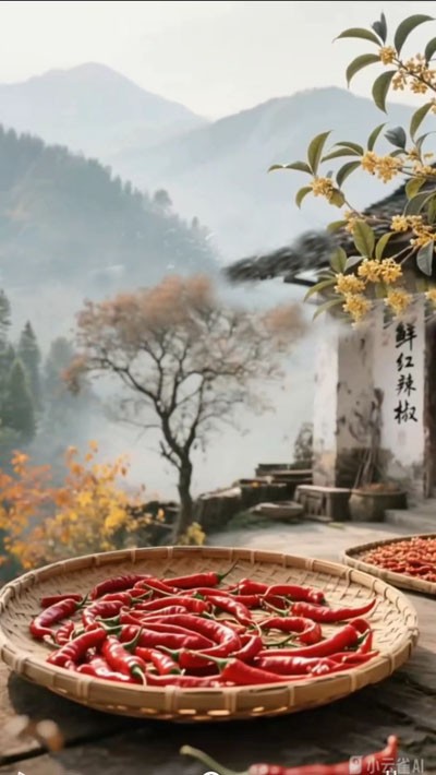 遠(yuǎn)山的剪影斜斜地倚在天際,如同水墨畫(huà)中未干的墨痕,濃淡相宜,意境悠遠(yuǎn),仿佛時(shí)間在此刻也學(xué)會(huì)了留白。嘉陵江的支流在不遠(yuǎn)處蜿蜒流淌,水聲輕緩如吟,像極了祖母在夏夜搖著蒲扇時(shí)哼唱的那首古老歌謠,低回婉轉(zhuǎn),沁入心脾,喚醒了記憶深處最柔軟的角落。院角那幾株桂樹(shù),悄然吐露著細(xì)碎而清冽的芬芳,不張揚(yáng),卻足以讓整個(gè)小院都浸染上秋日特有的氣息。風(fēng)兒輕輕一拂,香氣便調(diào)皮地躍入竹匾,與那一堆堆晾曬的紅辣椒撞了個(gè)滿懷——紅的熱烈奔放,香的清幽內(nèi)斂,恰似川中女子外剛內(nèi)柔、剛?cè)岵?jì)的性情,熱烈中藏著溫婉,煙火里透著詩(shī)意。