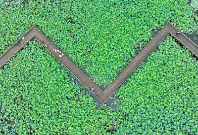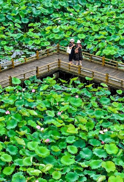 2025年6月25日,市民在四川省華鎣市明月鎮(zhèn)白鶴咀村利用渠江灘涂興建的“荷月江岸”生態(tài)荷塘打卡游玩。