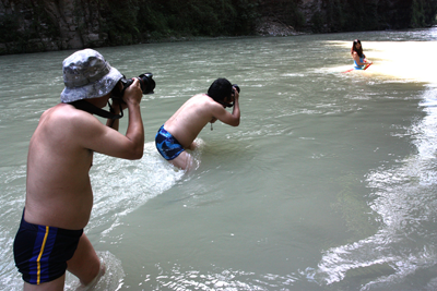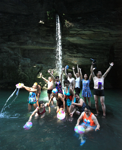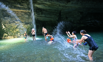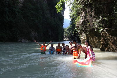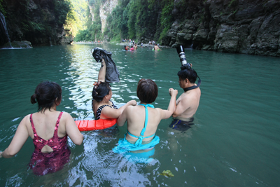 這兒消夏,不設(shè)門(mén)檻,不要門(mén)票,完全原生態(tài)景觀(guān)。瘋狂的潑水進(jìn)攻開(kāi)始了,管他“潑男”還是“潑婦”,只要開(kāi)心就好。大家越玩越瘋狂,還來(lái)了個(gè)趣味活動(dòng)游戲:瘋狂“狗飆尿”!楊村鄉(xiāng)向筒車(chē)壩電站方向前行約5公里就是狗飆尿景點(diǎn),從電站河邊開(kāi)始步行幾百米到達(dá)。(李正銀)