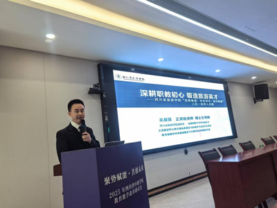 四川省旅游學校副校長吳越強以“深耕職教初心,鍛造旅游英才”為主題,為大家介紹了四川省旅游學校“雙師強基、實訓固本、教改賦能”三位一體育人實踐。會上,吳校長在職業(yè)教育產(chǎn)教融合、教學質(zhì)量監(jiān)控等領域做了精彩的發(fā)言,打造產(chǎn)教融合模式與成果,將專業(yè)群建在產(chǎn)業(yè)鏈上,將專業(yè)方向放在產(chǎn)業(yè)發(fā)展方向上,將師資鍛造融入產(chǎn)業(yè)發(fā)展進程中,將學生培養(yǎng)放在生產(chǎn)經(jīng)營過程中。對標行業(yè)發(fā)展趨勢,打造“沉浸式”名實訓基地。實行課堂革命新探索,創(chuàng)新人才培養(yǎng)模式。