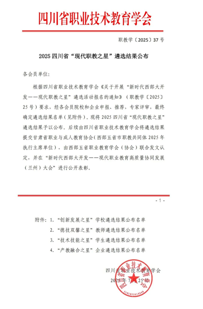 2025年7月25日,四川省職業(yè)技術(shù)教育學(xué)會(huì)正式公布2025年四川省“現(xiàn)代職教之星”遴選結(jié)果。四川省傅洪成名師工作室教師余自濤成功入選四川省“德技雙馨”教師,成為全省職業(yè)教育領(lǐng)域的師德與技能融合典范。