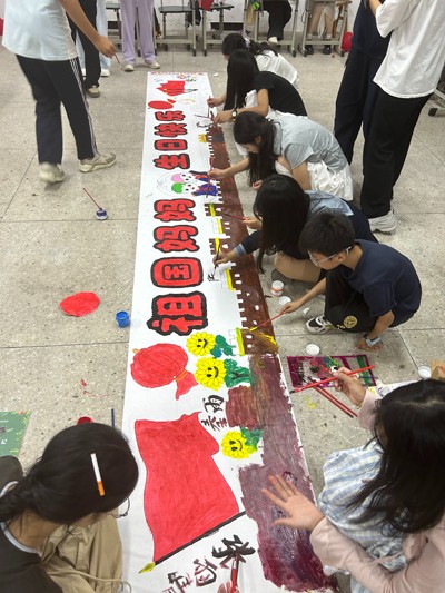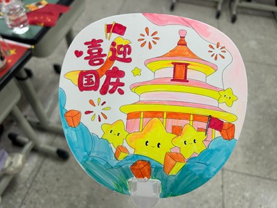 而最具視覺沖擊力的當屬“畫筆禮贊祖國”環(huán)節(jié)。同學們鋪開5米長的繪畫長卷,學生們分工協(xié)作,用畫筆勾勒天安門、長城、國旗等元素,以絢麗色彩訴說對祖國的熱愛;還有班級為每位同學準備空白扇子,大家或繪五星、或題“我愛中國”,一把把獨具特色的扇子,成為承載愛國情感的“移動畫卷”。