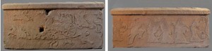 金龍村山形俊美、風(fēng)景秀麗,地理位置特別,西有長(zhǎng)秋山虎踞,東有岷江水蜿蜒,耳聽(tīng)老君廟晨鐘暮鼓,縱觀通濟(jì)堰潤(rùn)澤千年,歷來(lái)被傳為“風(fēng)水寶地”。在金龍村的山崖上高低錯(cuò)落分布了眾多漢代崖墓。在這些崖墓中,往往會(huì)發(fā)現(xiàn)石棺這種葬具,因其棺蓋和棺身有浮雕或線(xiàn)刻畫(huà)像故稱(chēng)畫(huà)像石棺。新津館藏的5具漢畫(huà)像石棺中有2具石棺(編號(hào)1號(hào)石棺和編號(hào)4號(hào)石棺)皆出土于金龍村。1987年,新津文管所在鄧雙鎮(zhèn)龍巖村(現(xiàn)為永商鎮(zhèn)金龍村)石廠灣一座裸露崖墓中發(fā)現(xiàn)一石棺(編號(hào)1號(hào)石棺),雕刻有朱雀、伏羲女?huà)z、車(chē)馬出巡、梁高行、魚(yú)、鳥(niǎo)魚(yú)六幅圖案。2000年,又在鄧雙鎮(zhèn)龍巖村(現(xiàn)為永商鎮(zhèn)金龍村)大云山一座崖墓內(nèi)出土一具畫(huà)像石棺(編號(hào)4號(hào)石棺),棺蓋上刻有連幣(彼此間以綬帶串聯(lián)的16枚方孔圓錢(qián))圖案,石棺上雕刻日月神、天祿辟邪、魯秋胡戲妻、狩獵圖等畫(huà)像。