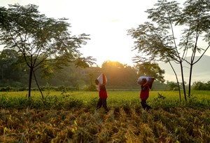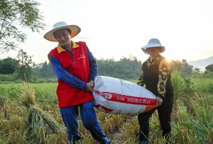 2023年8月10日, 國家電網四川省廣安華鎣市供電局組織的黨員志愿者身披朝陽, 在供區(qū)伏龍鎮(zhèn)青鳥石村幫助勞弱農戶裝運剛收獲的稻谷。
