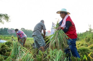 2023年8月10日, 國家電網四川省廣安華鎣市供電局組織的黨員志愿者身披朝陽, 在供區(qū)伏龍鎮(zhèn)青鳥石村幫助缺勞農戶江良明老人家收割水稻。