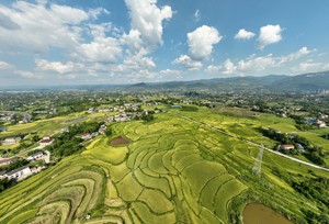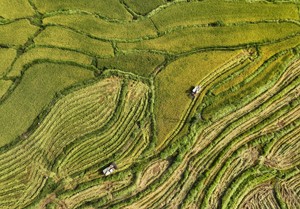初秋時節(jié),位于四川東部的廣安市種植的約200萬畝水稻相繼成熟,?連片翻著金浪的水稻猶如鋪設在大地上的“金色地毯”,在藍天白天映照下,把山村裝點得格外美麗。當?shù)剞r(nóng)民在田間忙碌搶收水稻,確保稻谷顆粒歸倉。