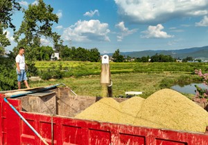 2023年8月15日,四川省廣安華鎣市華龍街道東方村的農(nóng)民在轉(zhuǎn)運收割機搶收的稻谷。
