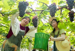 2023年7月12日,四川省廣安市社會保險局的黨員干部冒著酷熱,在華鎣市陽和鎮(zhèn)蔡家灣村幫農家搶收熟透了的葡萄,體驗勞動的艱辛。