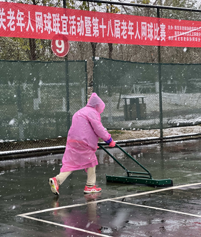 此次慰問背后,是謝淑蓉多年如一日對網(wǎng)球場的無私奉獻(xiàn)。67 歲的謝淑蓉退休已20多年,家中還有生活不能完全自理的兒子。作為網(wǎng)球分會會員,她每日最早抵達(dá)球場,不是拿起掃把掃地,就是用推水器推水,一年360天從不間斷。即便是下雨天,面對領(lǐng)導(dǎo)和球友的勸阻,她仍堅持清理球場,認(rèn)為此時更能有效推走球場上的泥沙。2023年1月15日南充下大雪,她冒雪清掃完六片網(wǎng)球場才肯回家。