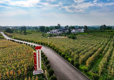 2025年7月21日,四川省華鎣市永興鎮(zhèn)馬架坪村連片泛著金黃的玉米和寬闊的鄉(xiāng)村公路及民居,在藍(lán)天白云映襯下色彩斑斕,如披錦繡。