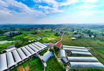 2025年7月21日,四川省華鎣市永興鎮(zhèn)馬架坪村連片用于種植養(yǎng)殖業(yè)的白色大棚和泛著金黃的玉米、綠油油的水稻及星羅棋布的民居,在藍(lán)天白云映襯下色彩斑斕,如披錦繡。(邱海鷹/攝影報(bào)道)