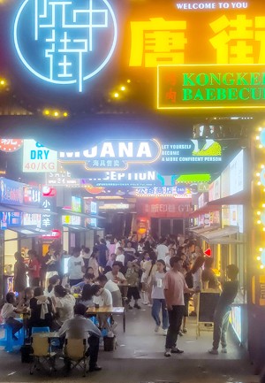 2023年7月16日晚,四川省廣安市市民在城南片區(qū)吾悅廣場(chǎng)新印巷新開業(yè)的“廣安首個(gè)示范性街區(qū)”游玩。(邱海鷹)
