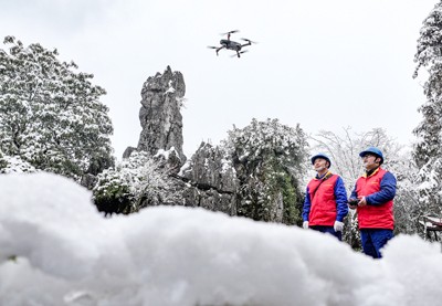 2025年1月10日,國家電網四川省華鎣市供電公司的共產黨員服務隊,踏著積雪奔忙在華鎣山區(qū),用無人機巡檢供電線路安全運行情況。(邱海鷹 張 鳳/文圖)