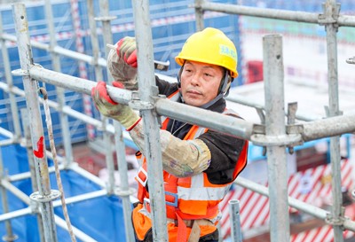 2025年2月2日(大年初五),在四川省廣安市廣安區(qū)官盛新區(qū)廣安理工學院建設工地,中建三局的建設者正冒著雨霧天氣在腳手架上緊張作業(yè)。