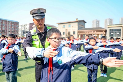 2025年3月27日,四川省華鎣市的交通警察在紅巖小學(xué)糾正學(xué)生利用大課間練習(xí)的“交通手勢操”,迎接第30個(gè)“全國中小學(xué)生安全教育日”。