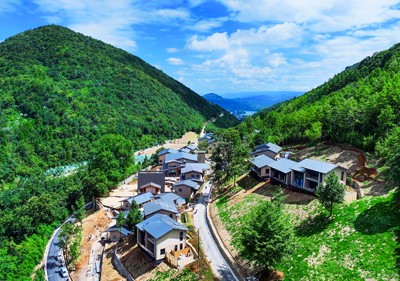 2025年8月21日,鳥瞰四川省華鎣市利用紅巖鄉(xiāng)高頂村廢棄的老龍洞煤礦改建的有熊貓?jiān)氐摹霸帷ず俚V熊貓”主題民宿。