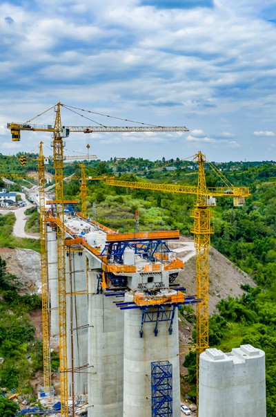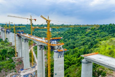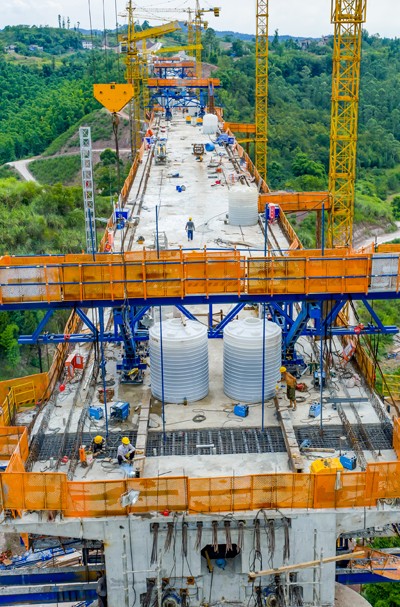 2025年8月23日,中鐵十局的建設(shè)者在西渝高鐵四川省廣安華鎣市明月鎮(zhèn)人和寨村林家溝特大橋施工現(xiàn)場,作連續(xù)梁順利合龍準(zhǔn)備。