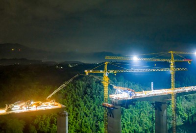 2025年8月23日,中鐵十局的建設(shè)者挑燈夜戰(zhàn)在西渝高鐵四川省廣安華鎣市明月鎮(zhèn)人和寨村林家溝特大橋連續(xù)梁合龍施工現(xiàn)場。(邱海鷹 劉 忠/文圖)