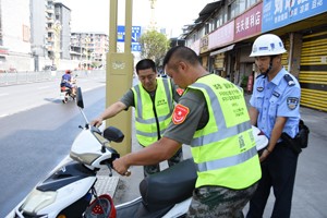 “過來一下‘兵哥哥’(退役軍人志愿服務(wù)隊隊員),把這三個亂放的摩托車抬到規(guī)范的停車位置上去。”在交警的指揮下,隊員范長青等二人協(xié)助交警把三輛摩托車從5米外地方抬到了停車位,汗水不斷從他們的身上冒出來。