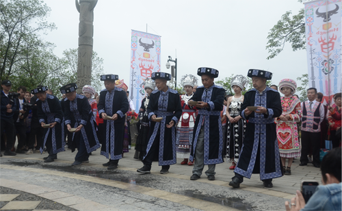 開幕式結(jié)束后,組織開展了從石海涌浪至石海僰寨旅游道上的苗族長(zhǎng)號(hào)、蘆笙、擺手舞、打蓮槍等表演形式的文化巡游活動(dòng)。