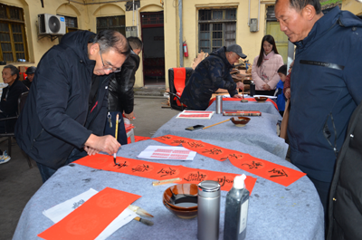 (上圖:旺蒼縣科協(xié)、旺蒼縣反邪教協(xié)會組織書法老師在東河鎮(zhèn)治城社區(qū)為群眾免費(fèi)書寫春聯(lián))