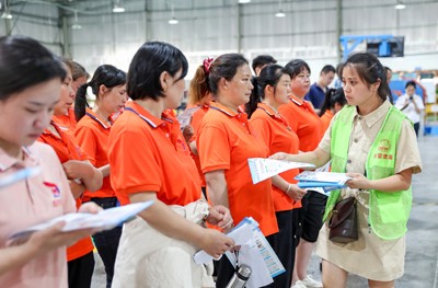 2025年6月23日,四川省華鎣市華鎣山經(jīng)開區(qū)大千電子廠的務(wù)工人員,在領(lǐng)取禁毒志愿者發(fā)放的裝有禁毒宣傳資料等物品的“法治大禮包”。
