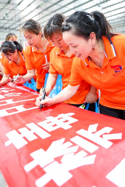 2025年6月23日,四川省華鎣市華鎣山經(jīng)開區(qū)大千電子廠的務(wù)工人員,在寫有“人人參與禁毒”等字樣的橫幅上簽字。