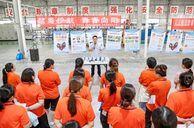 2025年6月23日,四川省華鎣市的禁毒志愿者在華鎣山經(jīng)開區(qū)大千電子廠,給務(wù)工人員開展“禁毒護航,青春向陽”主題宣傳活動。(邱海鷹/攝影報道)