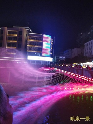 華燈初放廣場舞,音律噴泉七彩瑩。