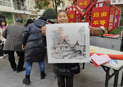 在書畫活動現(xiàn)場,書畫老師把事先畫好的寓意都很喜慶的書畫都寫好編號展示出來,居民們根據(jù)自己的喜好到書畫老師那報編號,書畫老師就會用靈巧的手,一會功夫,就畫出一副一模一樣的畫。觀的居民群眾都為老師點(diǎn)贊,紛紛都說,畫的好畫的好,帶一副回去掛在家里。