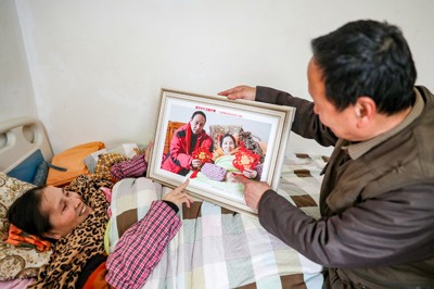 2025年2月28日,四川省廣安華鎣市古橋街道古橋社區(qū)因幾十年照顧癱瘓在床的妻子獲得“中國好人”殊榮的趙玉春,與妻子欣賞志愿者專程送來的“全家福”。