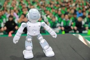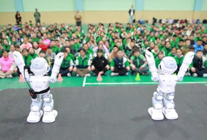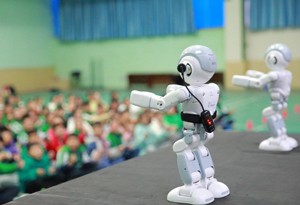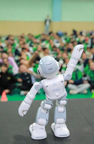 2023年11月13日,機器人在四川省華鎣市雙河小學為學生跳舞。