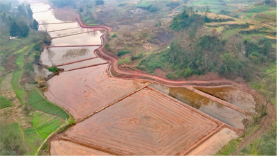 圖為天城鎮(zhèn)班子成員指導(dǎo)農(nóng)戶平田和田埂修整工作