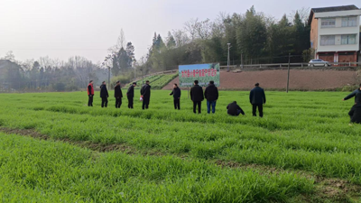 圖為天城鎮(zhèn)黨委書記王秋宇帶隊調(diào)研大竹縣小麥千畝高產(chǎn)示范片