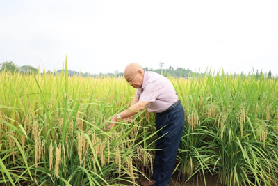 尤成林在種植基地拿著豐收景象沉甸甸的稻谷笑容滿面