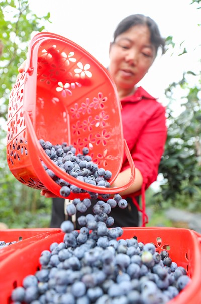 2025年6月4日,四川省華鎣市陽和鎮(zhèn)三岔河村村民, 在村頭的一眼藍莓園采摘銷往市場的特色水果藍莓。